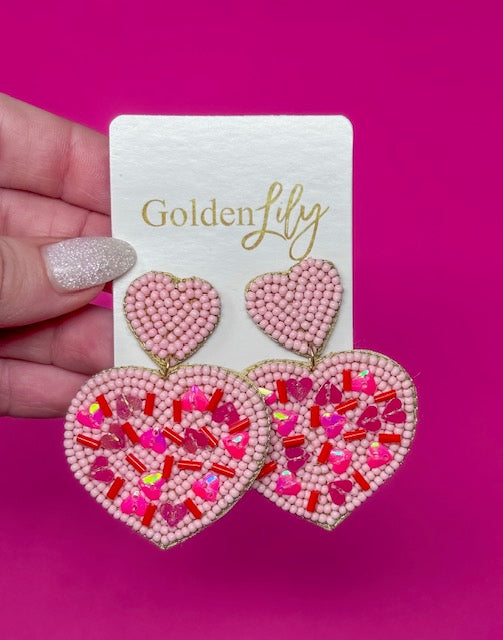 Bold, playful, and full of sparkle, the Valentine’s Heart of Gold Earrings are made to steal the spotlight. Featuring a layered heart design, these statement earrings are hand-beaded in soft pink and accented with colorful heart details and shimmering elements for a fun, eye-catching finish. The mix of textures and pops of color gives these earrings a whimsical, candy-inspired look that’s perfect for the season of love.