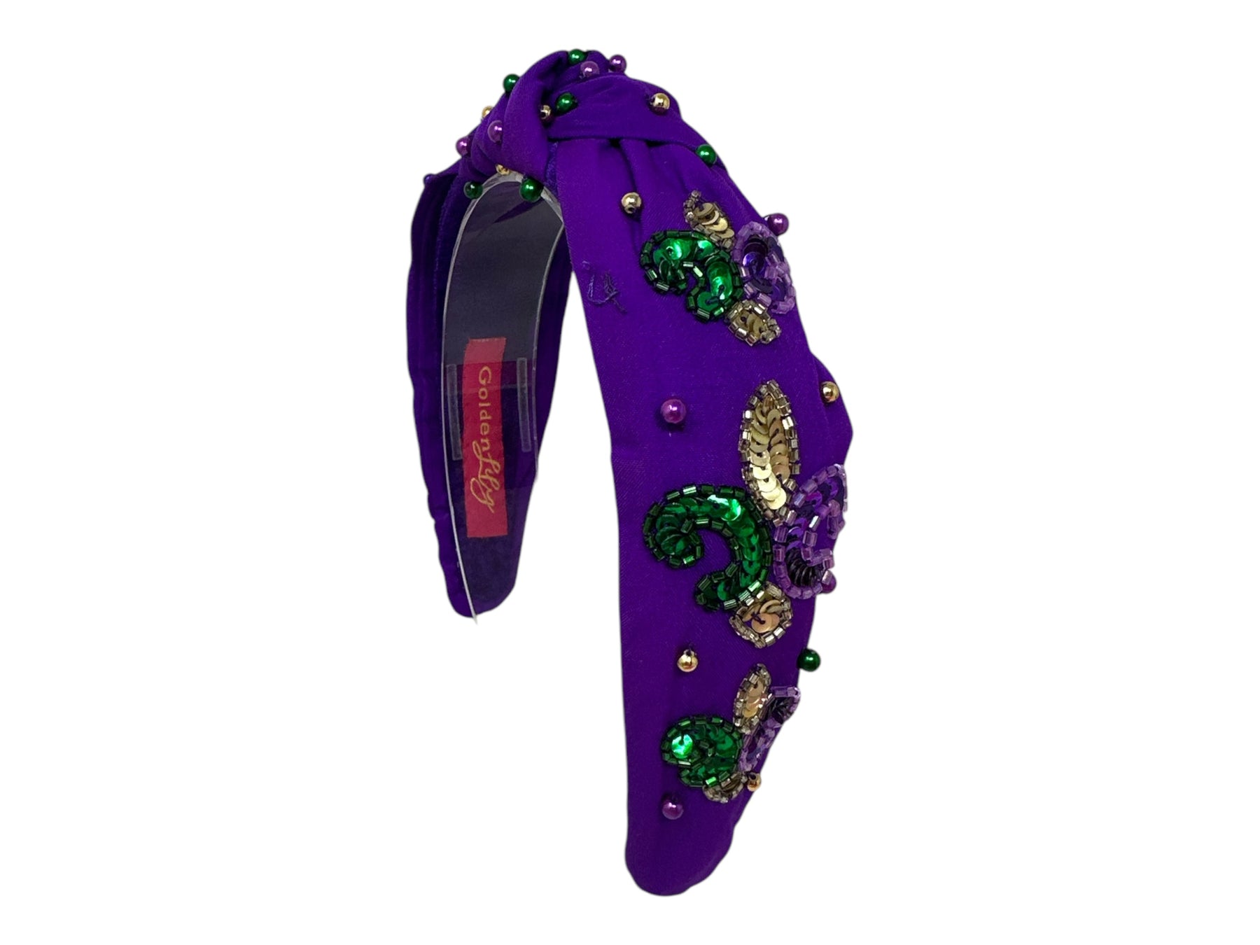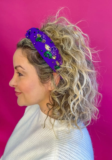 Make a bold, festive statement with the Mardi Gras Sequin Fleur De Lis Headband – Purple. Designed in a rich purple fabric, this padded headband is beautifully embellished with shimmering sequin fleur-de-lis motifs and metallic bead accents in classic Mardi Gras colors of purple, green, and gold.
