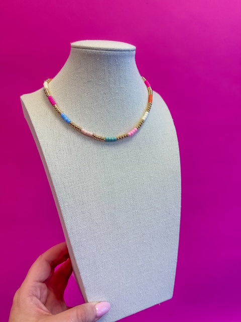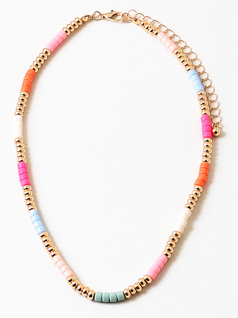 Add a soft pop of color to your everyday style with our Beaded Mix Bead Necklace – Multi. This playful yet polished piece features a mix of pastel-toned beads in shades of pink paired with sleek gold accents for a touch of shine.
