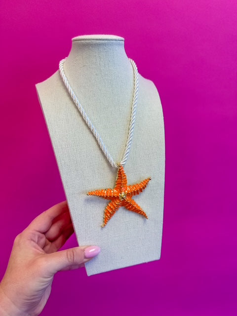 Make a bold, beachy statement with our Cord Necklace – Star Fish – Orange. Featuring a twisted white cord and a vibrant orange starfish pendant, this piece brings the perfect pop of color to your summer style. The textured starfish is accented with subtle gold-tone details, adding just the right touch of shine.