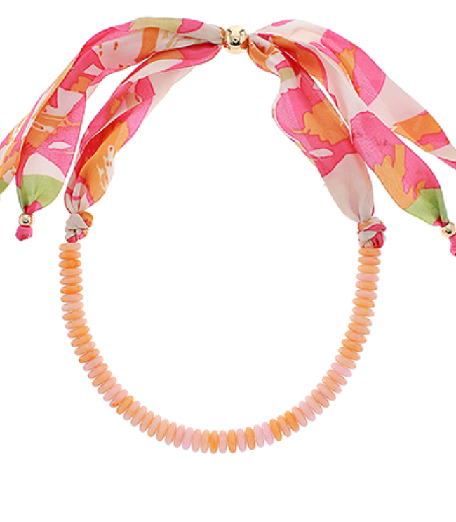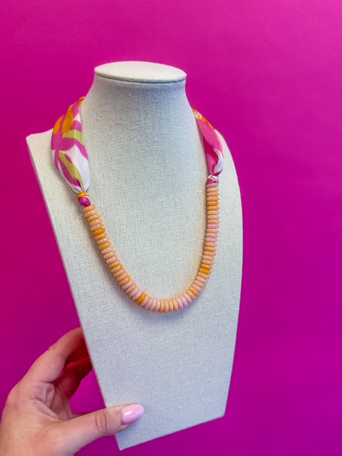 Add a fun, feminine touch to your look with the Scarf and Bead Necklace in pink. This stylish piece features soft blush and peach-toned beads paired with a vibrant patterned scarf tie, creating a playful mix of color and texture. The lightweight design and adjustable fit make it as comfortable as it is eye-catching.