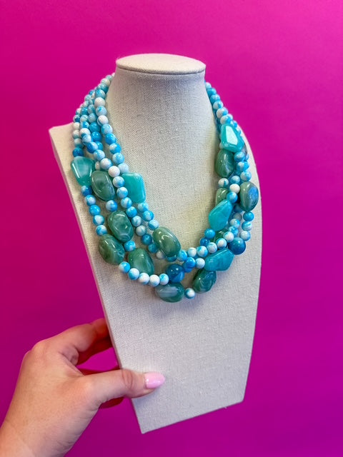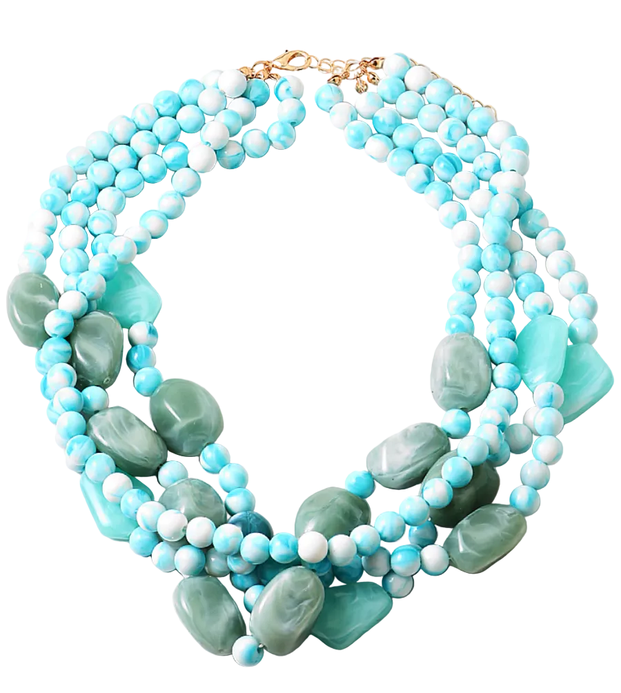 Make a bold, beachy statement with our Statement Gem Necklace – Turquoise. This eye-catching piece features layered strands of marbled turquoise and white beads, accented with oversized polished gemstone details in soft seafoam and aqua tones.