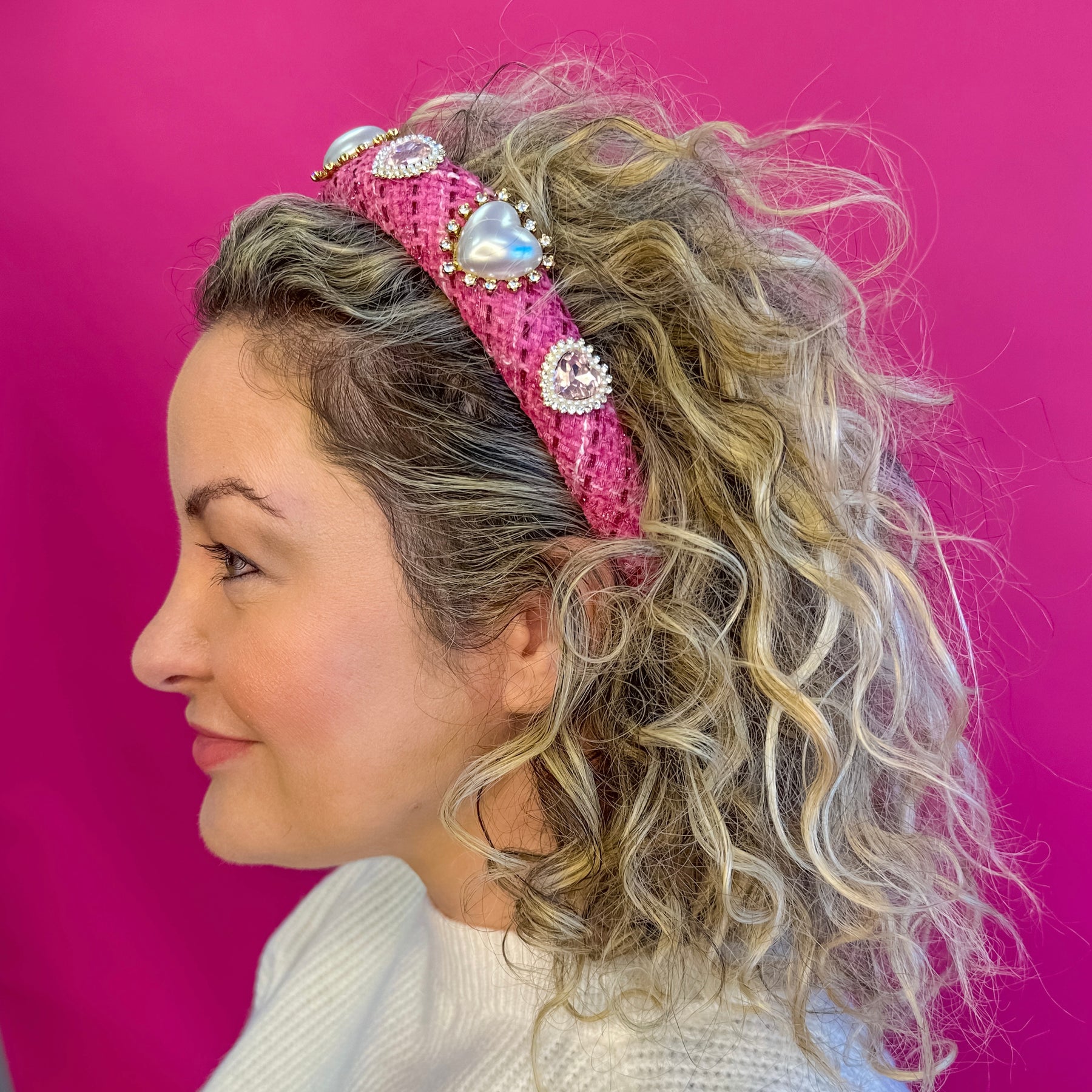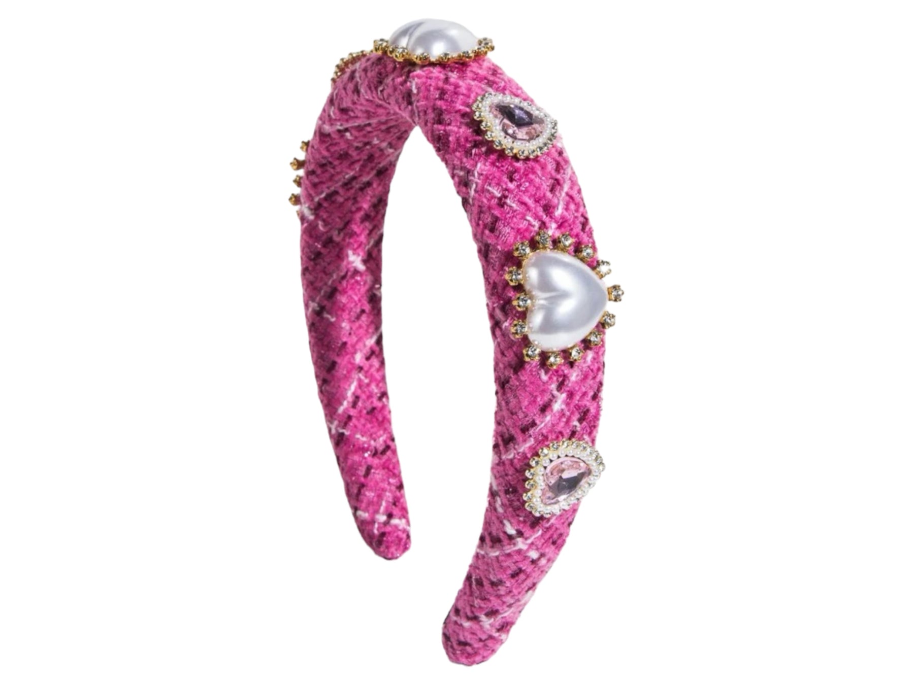 Turn up the charm with the Solid Headband – Tweed Heart – Hot Pink. Crafted in a vibrant hot pink tweed fabric, this padded headband is adorned with pearl heart accents and sparkling rhinestone details for a bold, feminine statement.