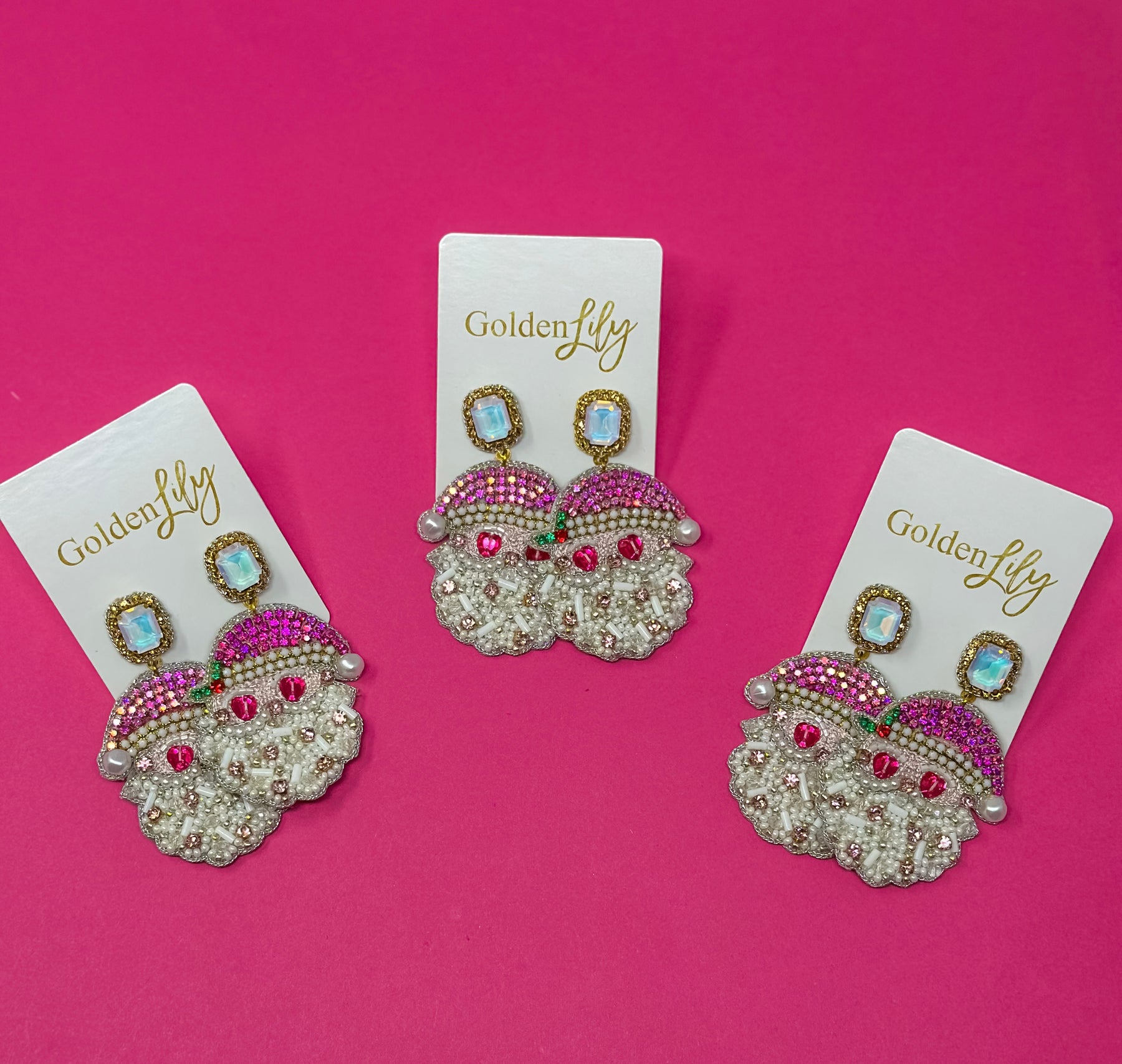 Bring a sweet touch of retro Christmas charm to your holiday style with our Christmas Vintage Santa with Pink Earrings. These stunning statement earrings feature a beautifully beaded vintage-inspired Santa face, brought to life with sparkling pink accents, iridescent stones, and intricate hand-placed beads.