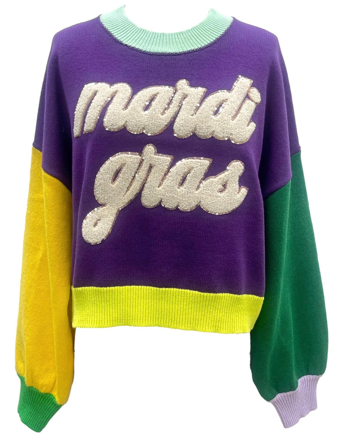 Whether you're celebrating Mardi Gras or just love a pop of color, this sweater will make sure you stay warm, stylish, and ready to party in true Queen of Sparkles fashion.