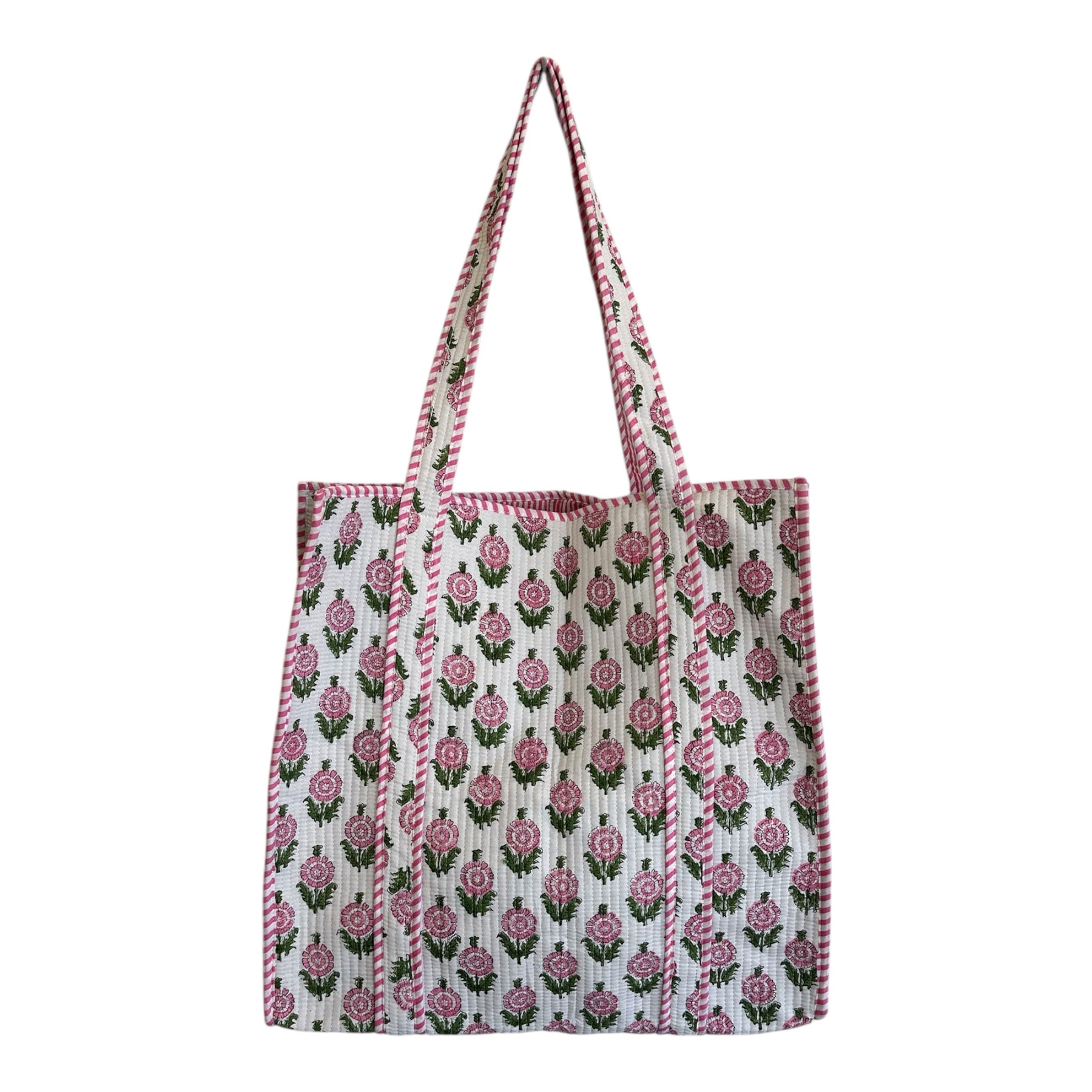 Fresh, feminine, and beautifully detailed—our Quilted Block Print Tote in White & Pink Floral is the perfect everyday companion. Featuring charming pink floral motifs on a soft white quilted base, this tote brings a touch of whimsy and elegance to any outfit. The striped pink trim adds the cutest finishing touch, giving the bag a bright and cheerful look.